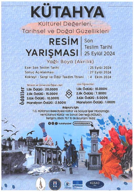 2024 yılı Kütahya'nın tarihi, kültürel değerlerini ve doğal güzelliklerini tanıtmak ve sanatsal bir farkındalık yaratmak amacıyla lise ve dengi okul öğrencilerine ve üniversite öğrencileri ile amatör sanatçılara yönelik "Kütahya' nın Kültürel Değerleri, Tarihsel ve Doğal Güzellikleri Resim Yarışması" düzenlenecektir. Ulusal çapta düzenlenecek yarışmanın afişi ekte sunulmuş olup, yarışma şartnamesine https://www.kutahya.bel.tr/ adresinden ulaşılabilir. Bilgilerinize sunar,