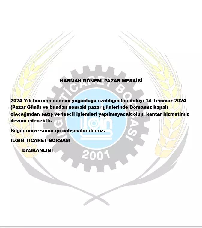 Since the intensity of the 2024 harvest season has decreased, our Stock Exchange will be closed on July 14, 2024 (Sunday) and the following Sundays, and therefore sales and registration transactions will not be made, and our weighbridge service will continue.