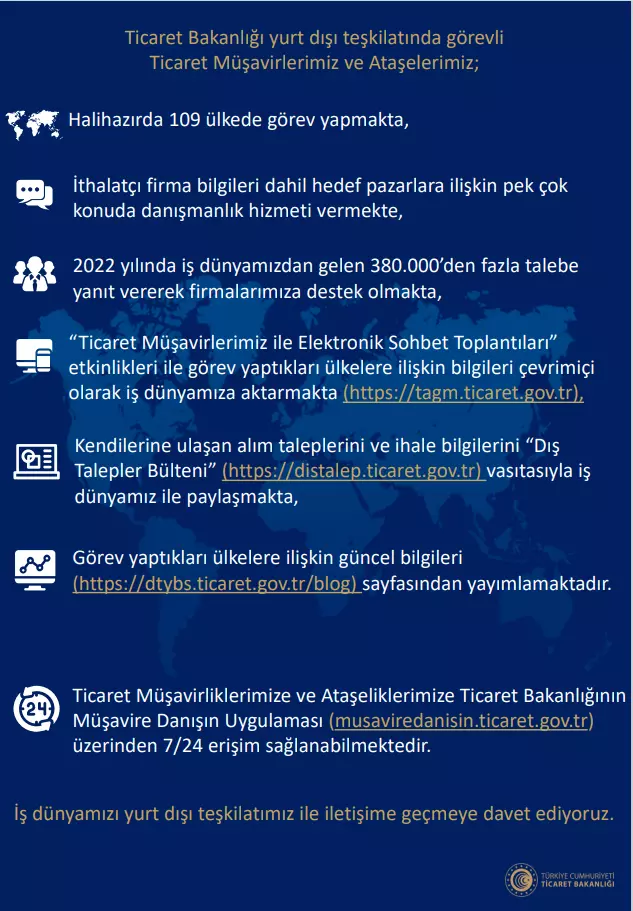 Ticaret Bakanlığı bünyesinde yer alan 109 ülkede görevli Yurt Dışı teşkilatının, iş insanlarımızın yurt dışı pazarlarına ilişkin olabilecek tüm soruları ve taleplerine yanıt bulabilecekleri ve ekonomik ilişkiler içerisinde bulunduğu ve bulunacağı birçok ülke ve sektör ile ilgili olarak bilgi alabilecekleri platformlar oluşturulmuştur.