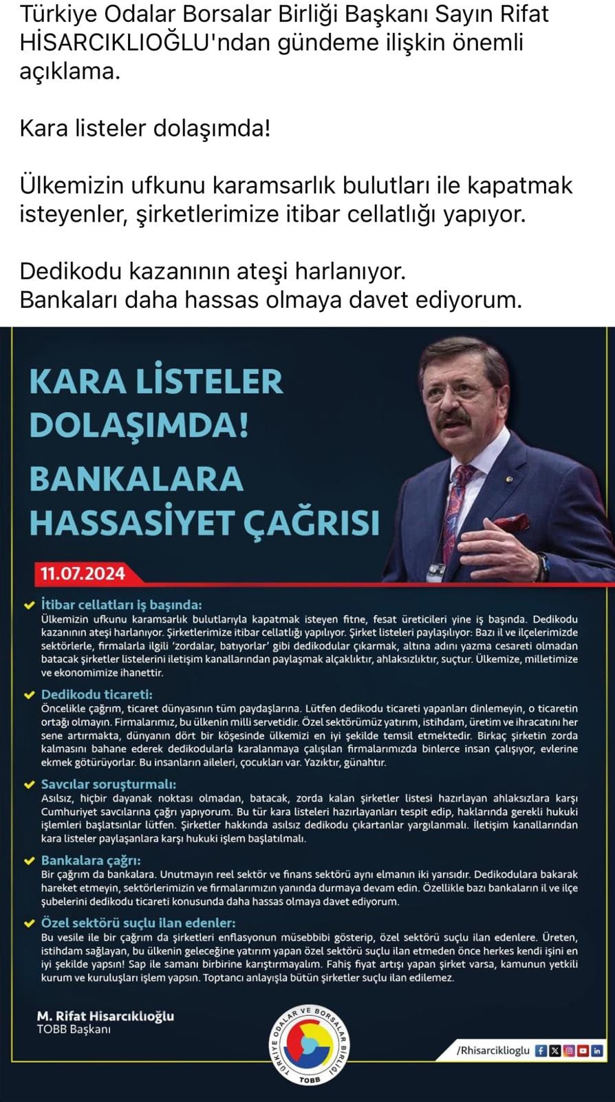 Türkiye Odalar Borsalar Birliği Başkanı Sayın Rifat HİSARCIKLIOĞLU'ndan gündeme ilişkin önemli açıklama.