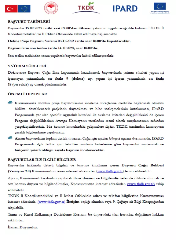 Tarım ve Orman bakanlığının ilgili kuruluşu olan Tarım ve Kırsal Kalkınmayı Destekleme Kurumu (TKDK) 29 Ağustos 2025 tarihinde IPARD III Dokuzuncu Başvuru Çağrısı İlanına çıkmış bulunmaktadır.