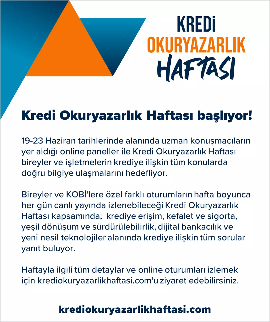 Kredi Okuryazarlık Haftası başlıyor. 19-23 Haziran tarihlerin de, bireylerin ve kurumların finansal hayatları daha sağlıklı ve etkin yönetmelerine katkı sağlamak amacıyla, söz konusu haftada her gün kredi okuryazarlığı konusunda siz değerli üyelerimiz https://krediokuryazarlikhaftasi.com adresinden katılım sağlayabilirsiniz.